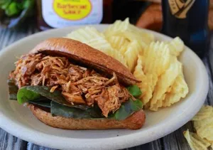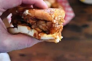 - Drizzle 1/4 cup BBQ sauce over cooked chicken and add brown sugar and let simmer 2-3 minutes before removing from heat.