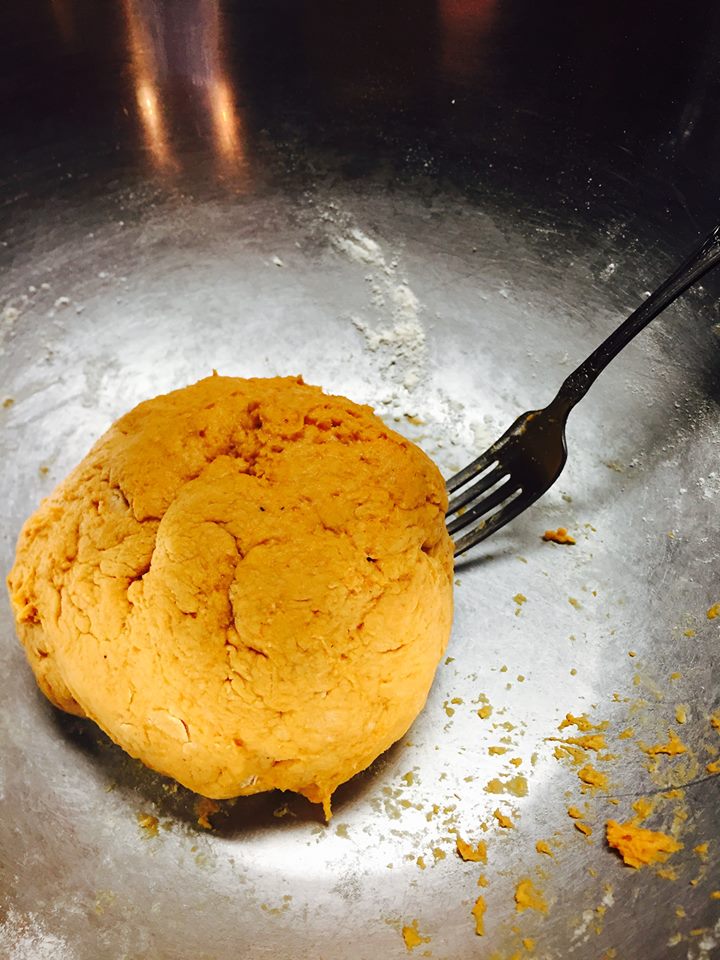 4. Combine pumpkin mixture into flour mixture with fork and combine well and then form into a ball