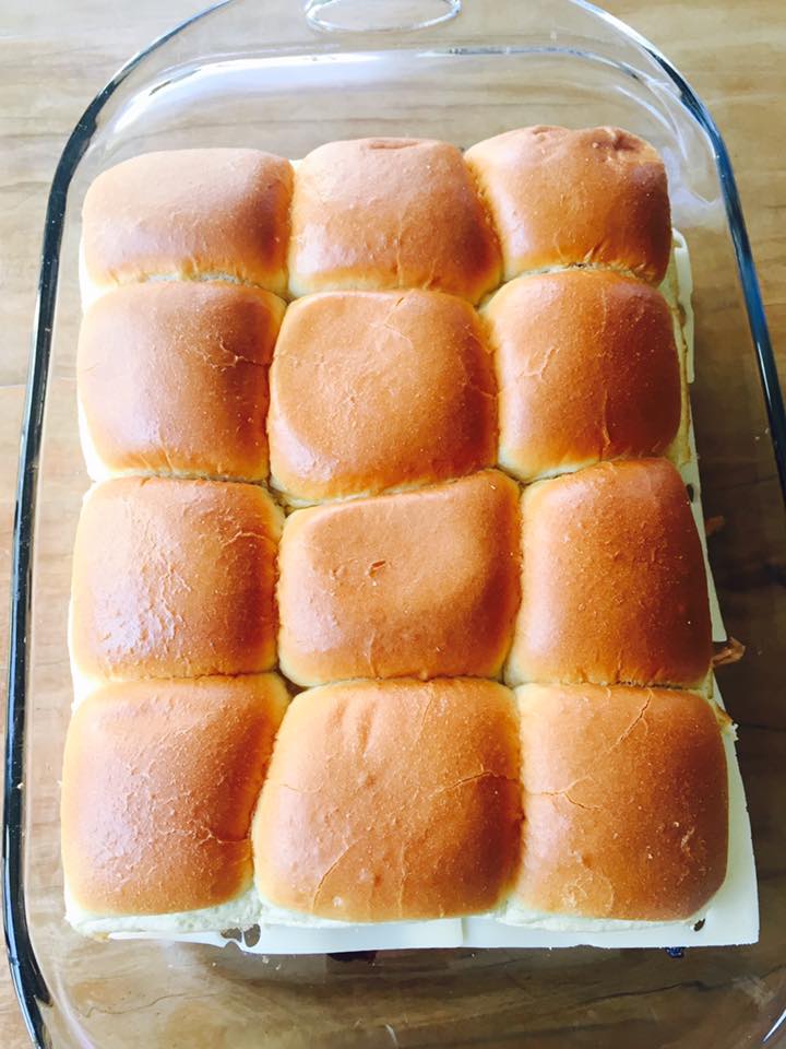 - Cut Hawaiian rolls in half and place bottom portion in greased 9 x 13 pan