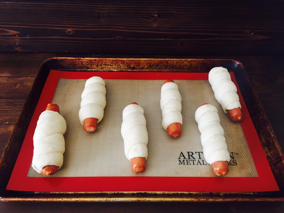 - Divide dough into 6 balls, roll out, and wrap around cheddar wursts