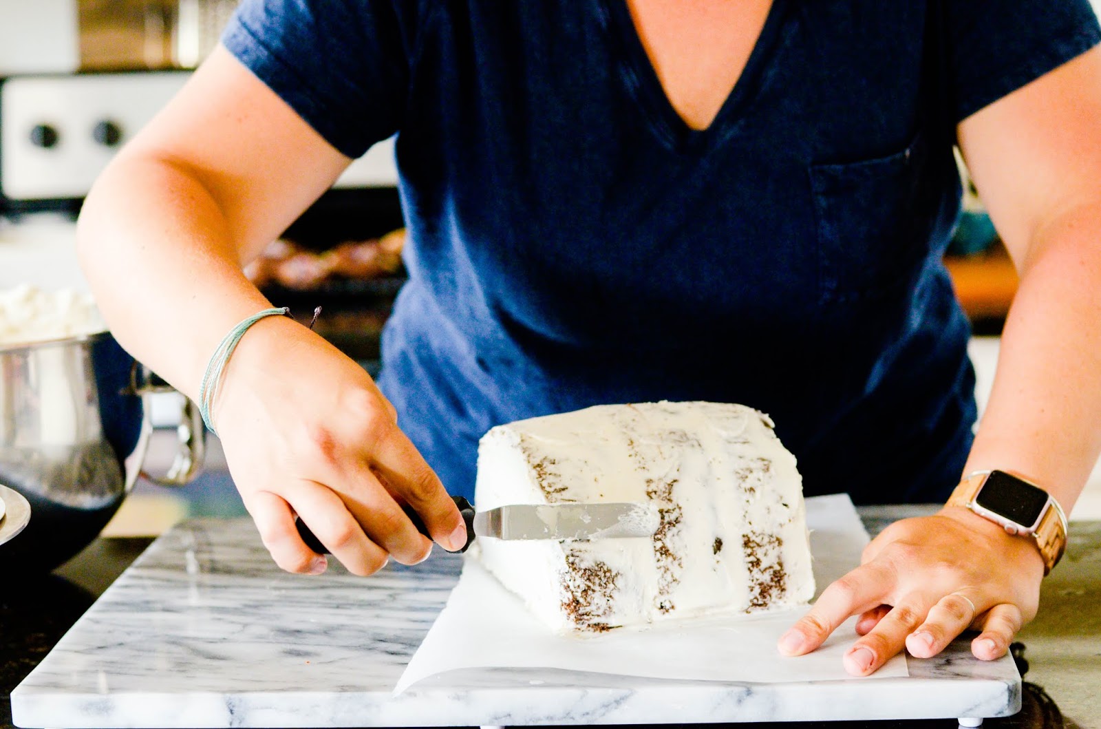 3. Frost the outside of the cake (if seeking to create a smooth outside layer, first apply a crumb coat and chill before applying the final– smooth– layer of buttercream).