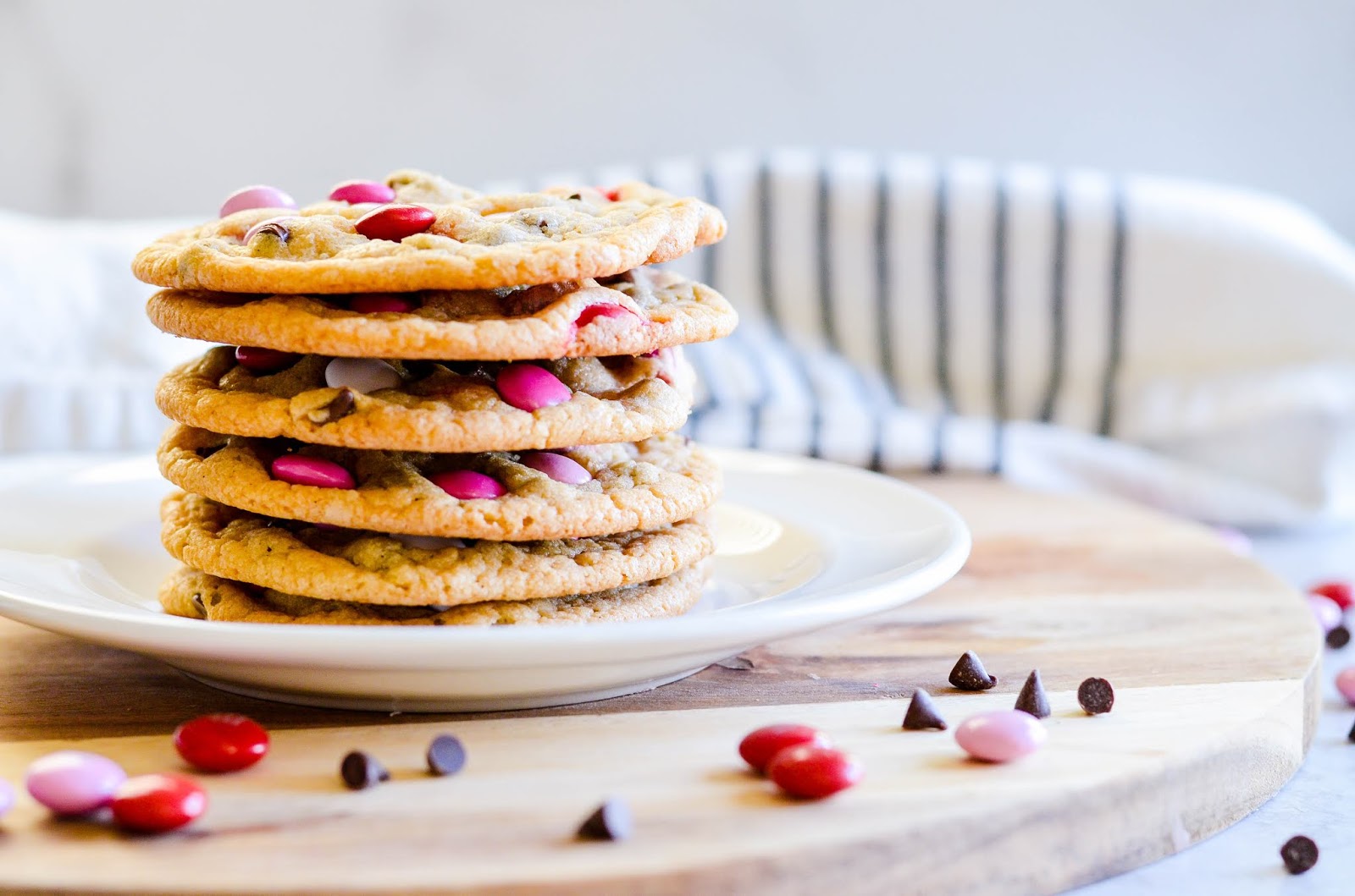 I made these Valentine’s Day M&M Cookies using my all-time very favorite master chocolate chip cookie recipe. The edges are golden and crispy, the centers are gooey and chewy and delicious. They’re a little on the thin side, which is my absolute favorite kind of cookie to eat. But if you prefer a thicker cookie, just add a little bit more flour (about 1/4 cup).