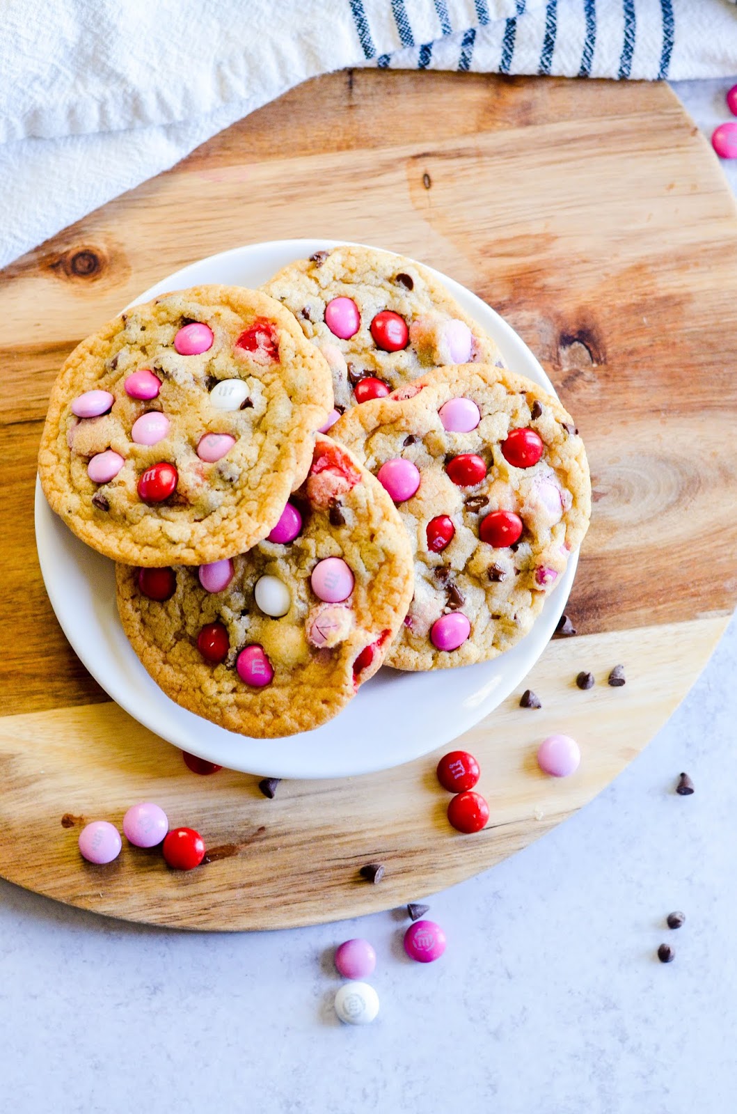 I made these Valentine’s Day M&M Cookies using my all-time very favorite master chocolate chip cookie recipe. The edges are golden and crispy, the centers are gooey and chewy and delicious.