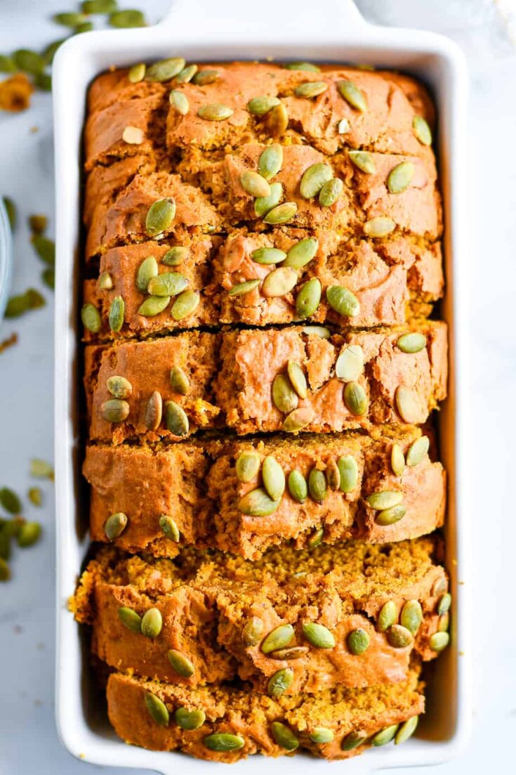 Starbucks Pumpkin Bread is topped with crunchy, little pepitas. Pepitas are the green pumpkin seeds inside of the white outer shell (which is what most people identify as ‘pumpkin seeds”).